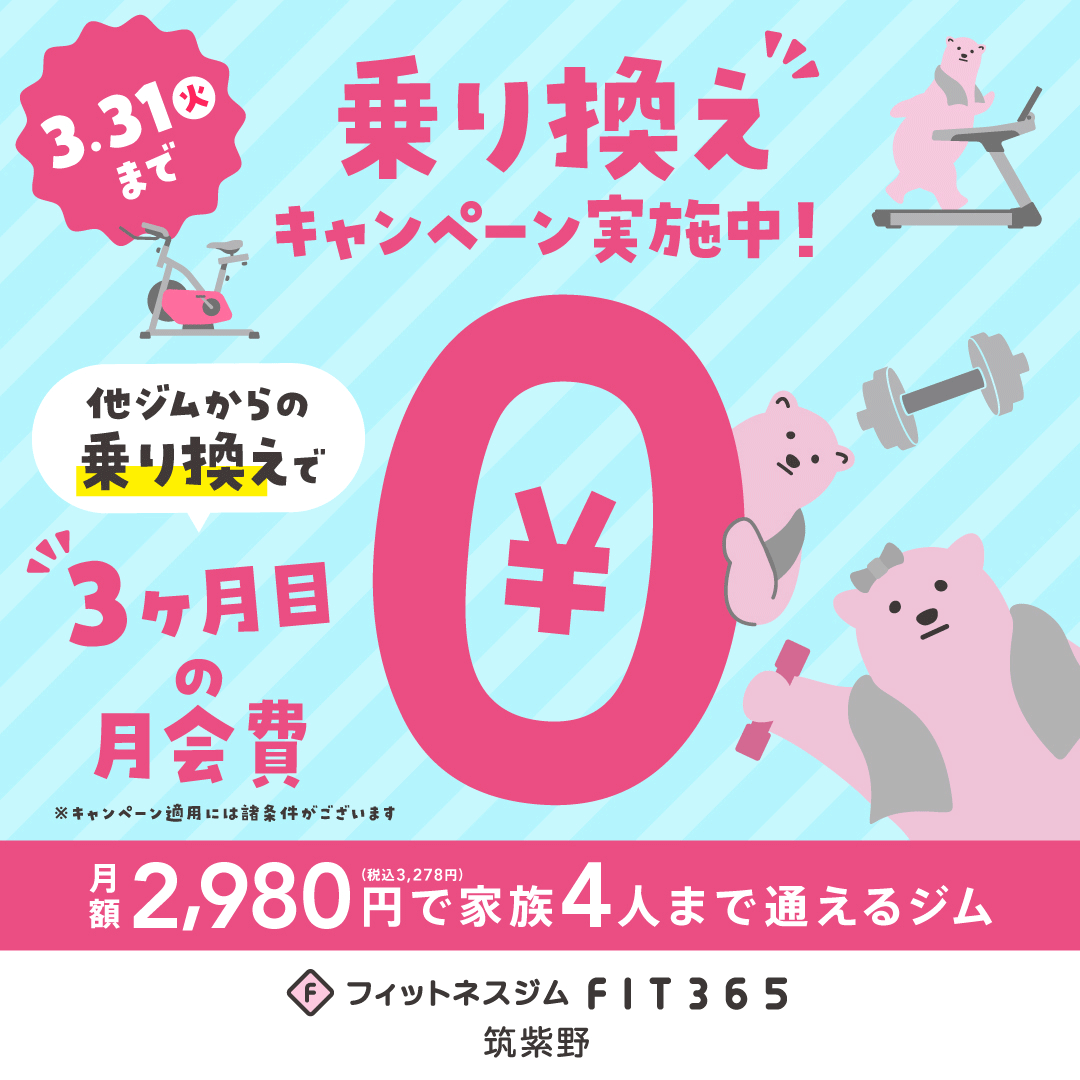 3ヶ月間も月会費が0円になっちゃうこの機会に、ぜひFIT365へお越しください🧸