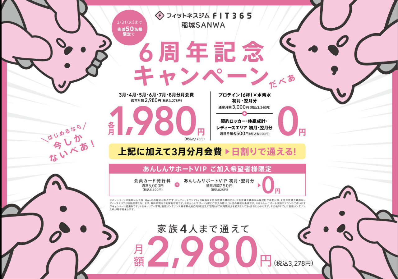 ※5:FIT365あんしんサポート、タンニングマシン、コラーゲンマシン、水素水、水素水+プロテイン(6杯)は登録会員の方のみご利用いただけます。家族会員の方はお申込み、ご利用いただくことは出来ません。