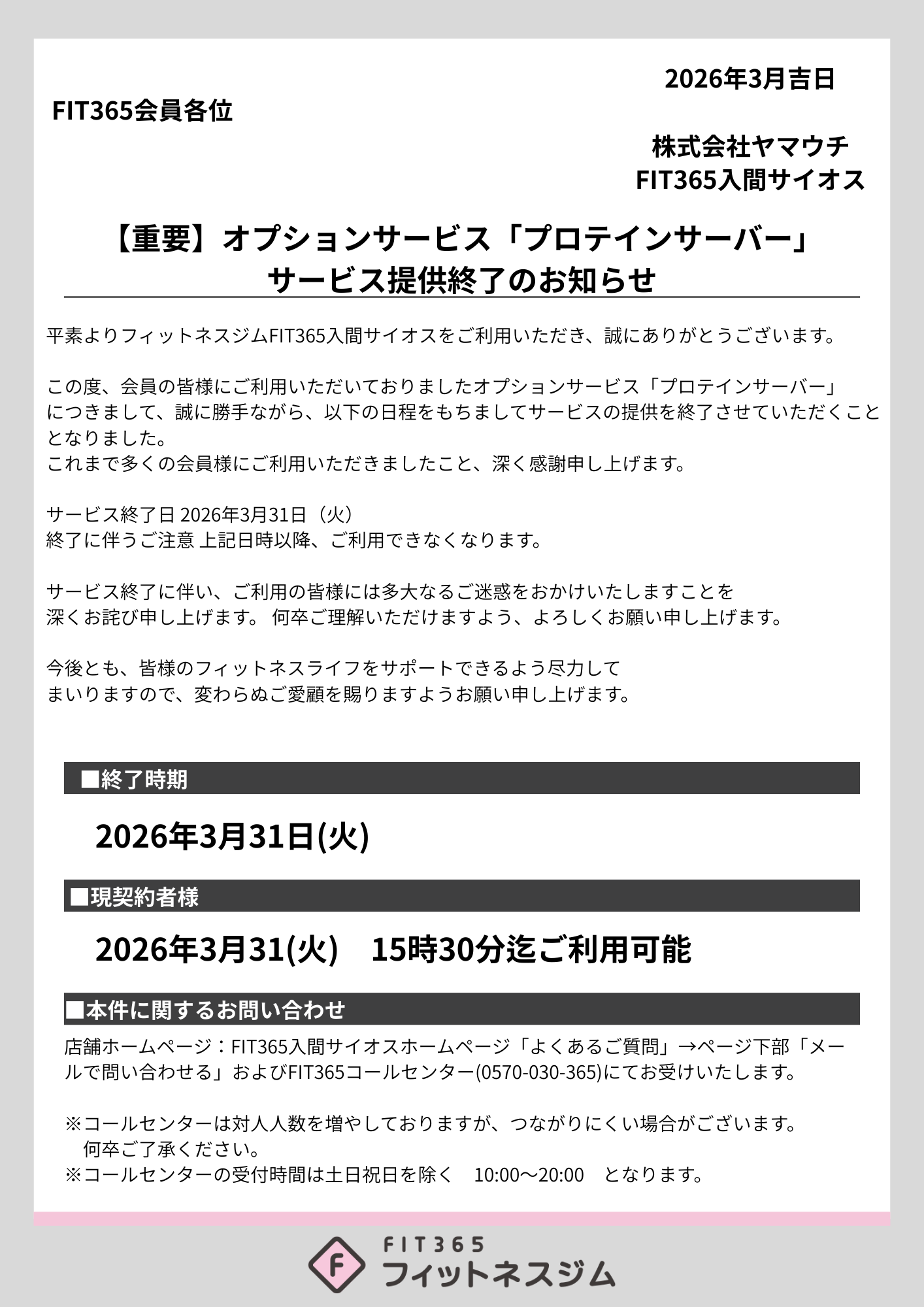 2025年2月より、FIT365入間サイオスは無人店舗として運営いたします。