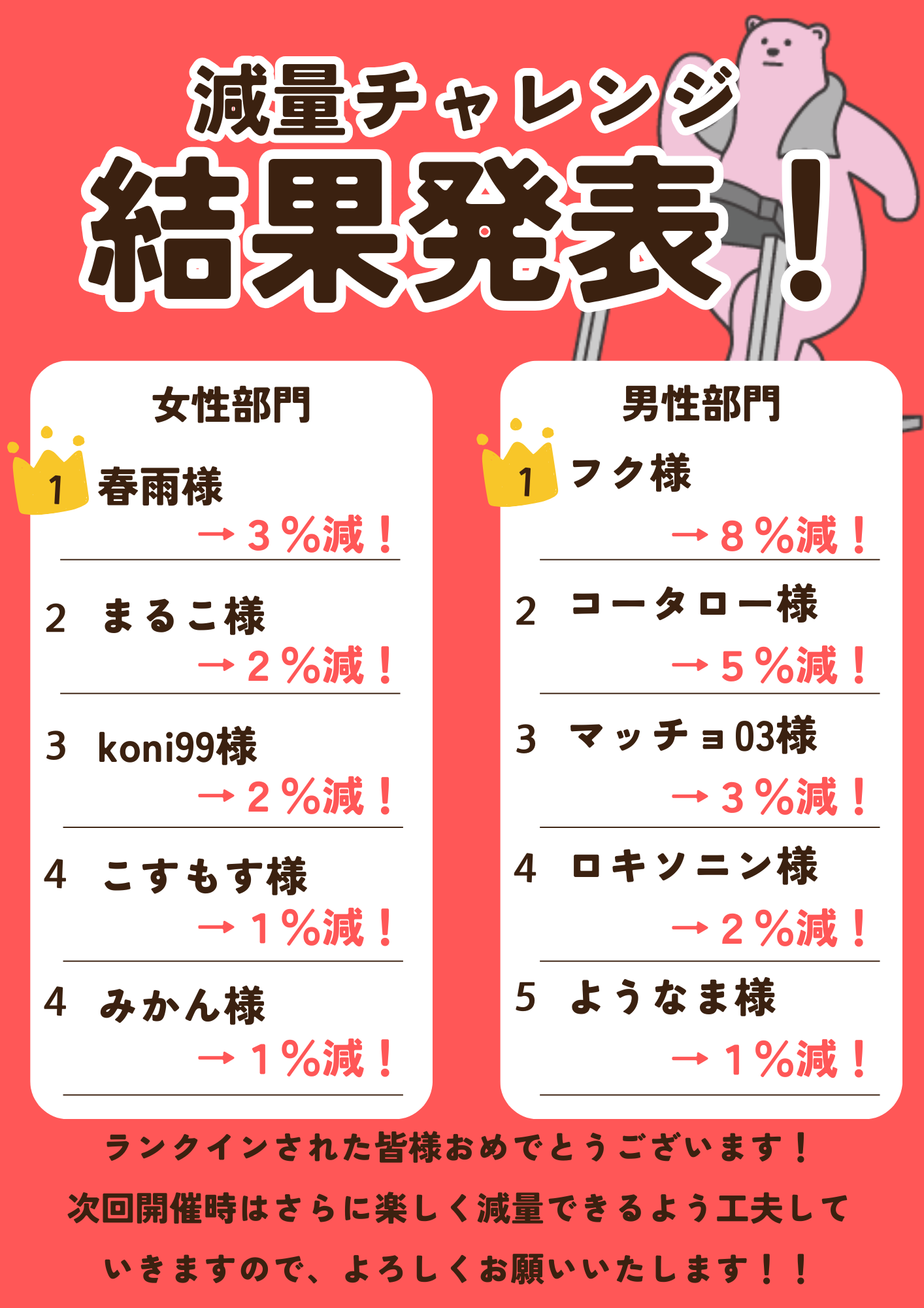 お待たせいたしました!2026年春の減量チャレンジの結果発表です!!