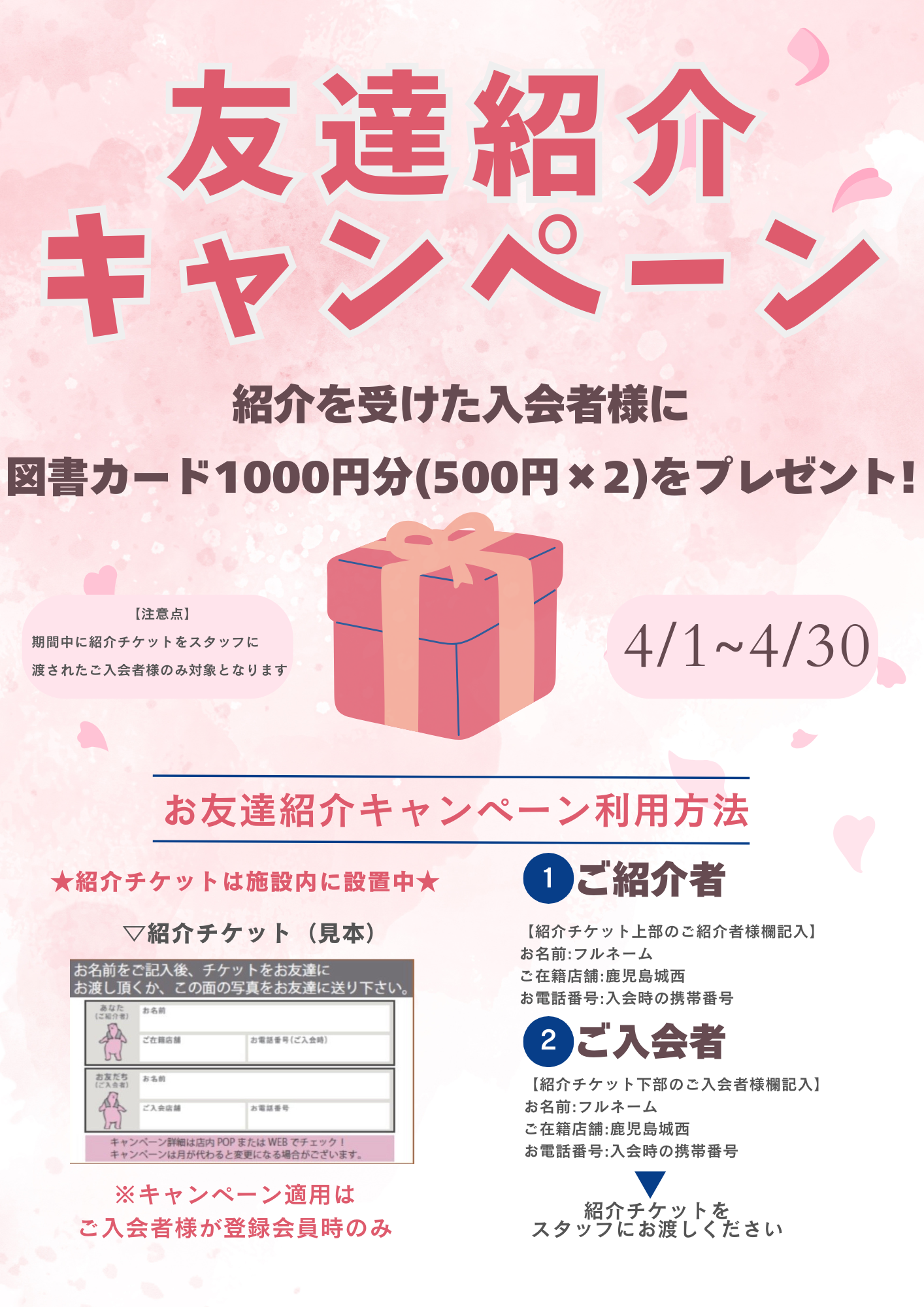 店舗内外に設置してあるチケットに紹介者・新規入会者の
