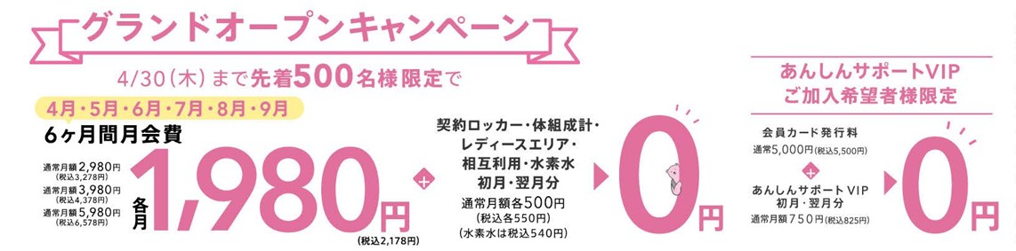 24時間営業ジムですがグランドオープンの4月1日は10時前はご利用いただけませんのでご注意ください。