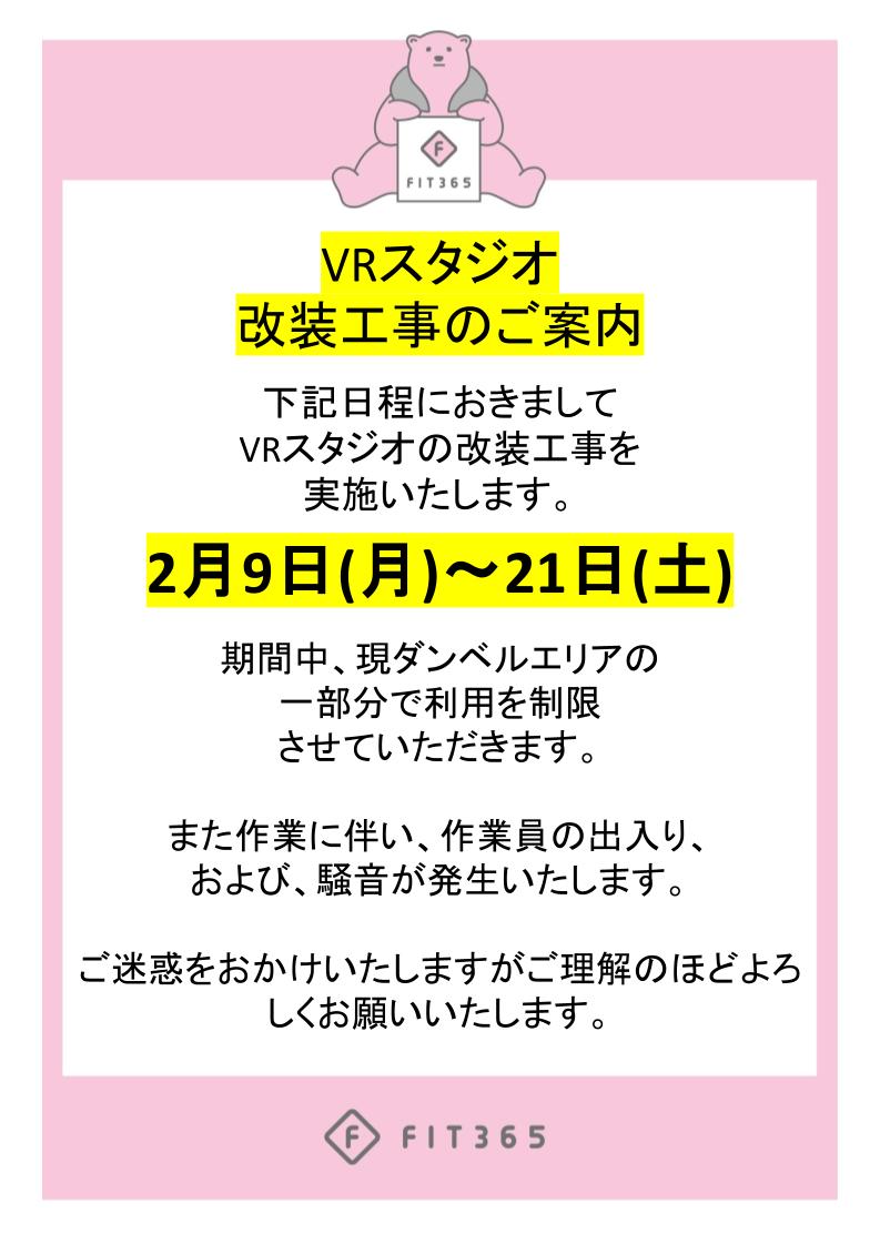 2月9日(月)~2月21日(土)の間、VRスタジオの改装工事を実施いたします。